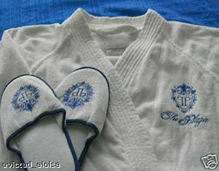 This kimono-style robe is made of white terry velour (420 GR) 100% cotton. It is made in Turkey and has the famous double P logo as well as "The Plaza" embroidered on it in blue. It is made from heavy terrytowel and there are two patch pockets at the front and a wrap belt. This vintage robe was used in a guest room and is still in great condition!! (no stains or holes) I think that The Plaza robe may be the quintessential Plaza collectibe. These spa-style robes are incredibly luxurious and they're definitely a "must-have" for the fall season. US $150.00 plus shipping |